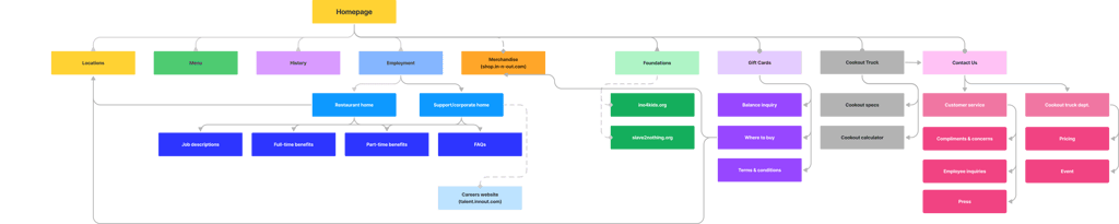 in-n-out.com has numerous hyperlinks, tabs, and popups but no sub-menus. I created a site map to understand how the pages connect.
