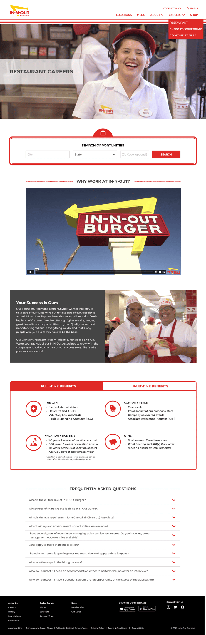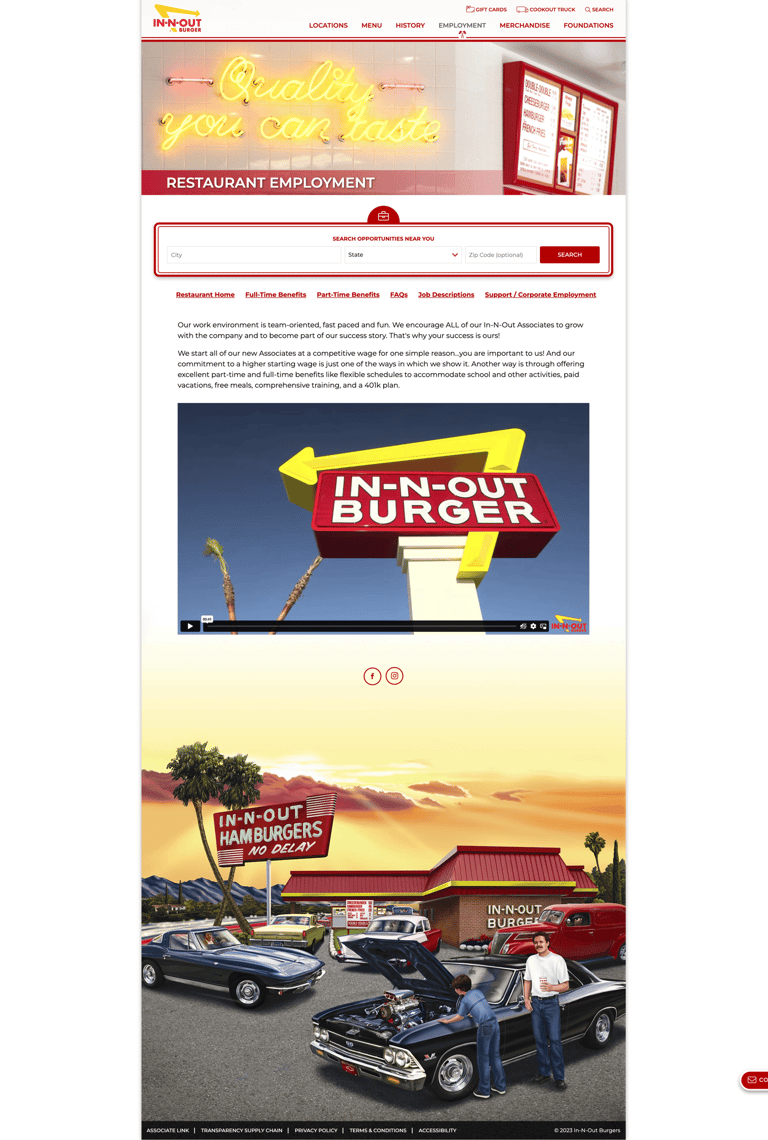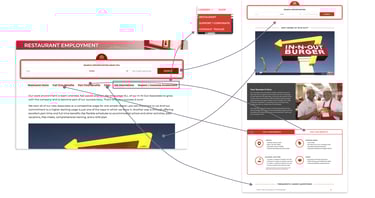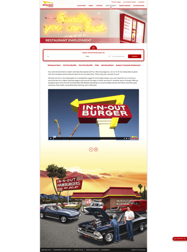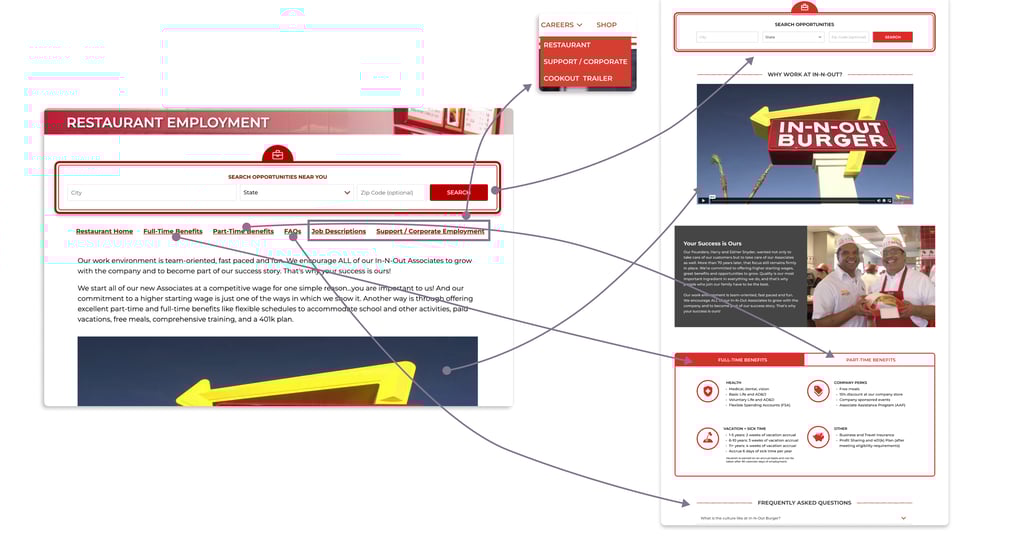 The current careers page hides information behind hyperlinks that are used as tabs. There are unclear paths for finding the external career sites for corporate and cookout trailer employment. In-N-Out also doesn't promote itself as well as its competitors. My changes: