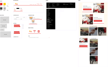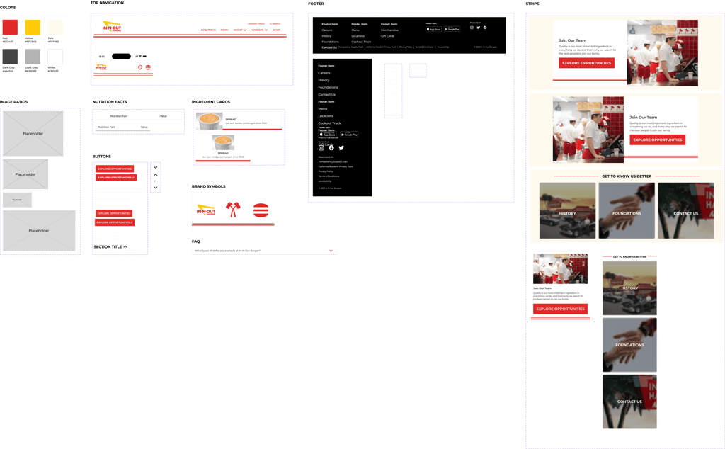 I developed a mini design system in Figma to build my screens. I added a couple of neutral colors to the In-N-Out palette, designed new assets, and created desktop and mobile variations.