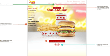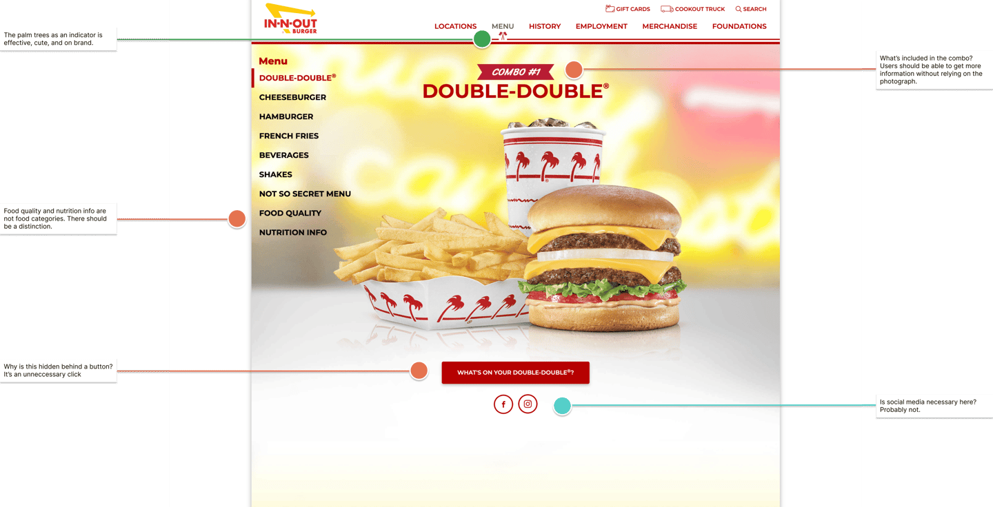 Although the In-N-Out menu is simple, the website's menu page is frustratingly complex. Non-menu items like nutrition facts and food quality are placed under the menu, and the ingredients are hidden in an image carousel. My changes:​