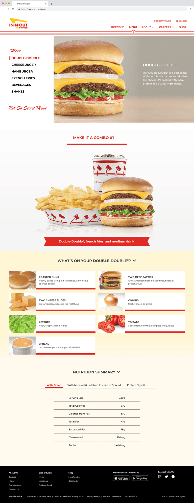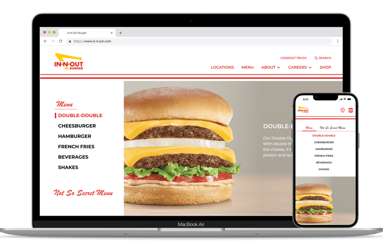 Since I can't publish the proprietary work I did for a food and beverage client, I wanted to complete a personal project that showcases some of the skills and design practices I gained from the project. I chose to complete a redesign of the In-N-Out desktop and mobile website experience.