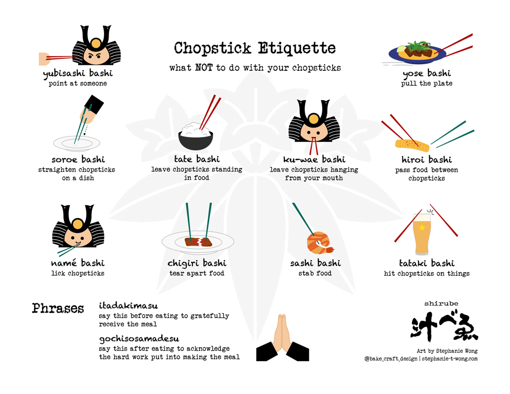 A friendly infographic my former employer commissioned to teach customers proper chopstick etiquette. It features the restaurant's samurai mascot, family crest, and popular dishes.