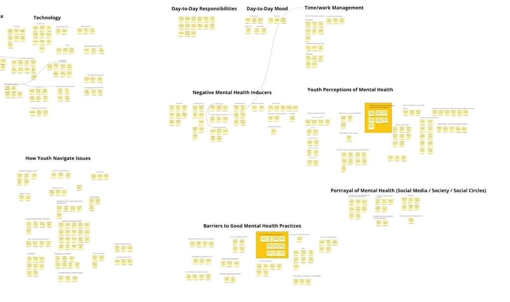 Based on feedback from Headspace, we narrowed our research to youth's daily routines, their existing mindfulness practices, and how they approach conversations about mental health. We developed an interview protocol with 15 primary interview questions and conducted 16 virtual semi-structured interviews over two weeks. I participated in 7 of the interviews as an interviewer or notetaker. We then created an affinity diagram to identify themes.