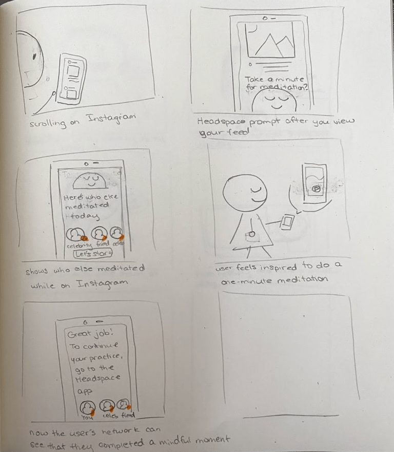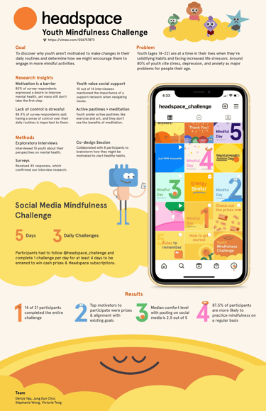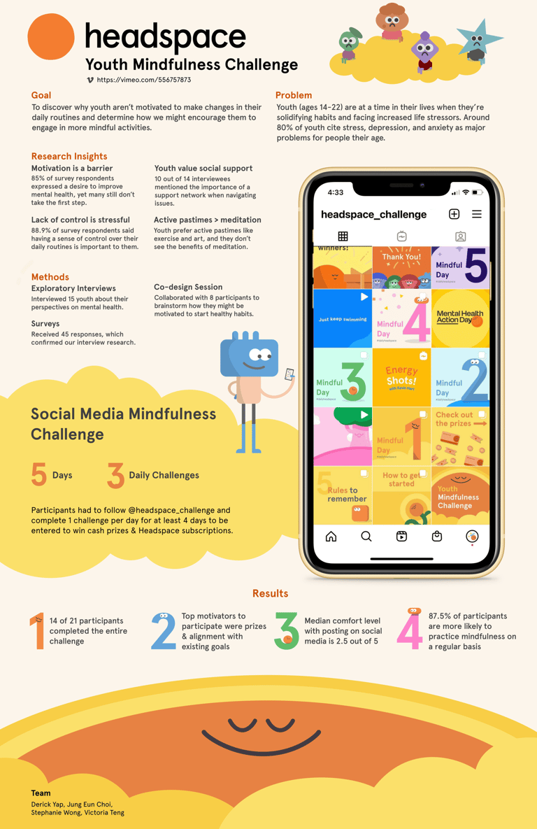 We developed a 5-day social media challenge that incentivizes youth to incorporate mindfulness activities into their everyday routines. This solution aligns with Headspace's goals, my team's capabilities, and youth motivators.