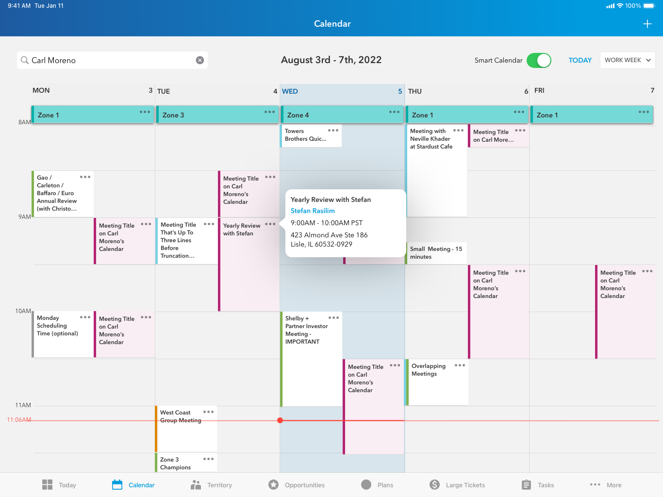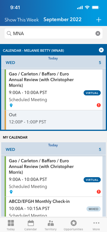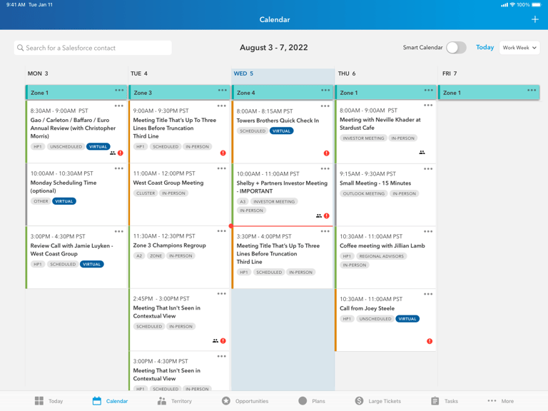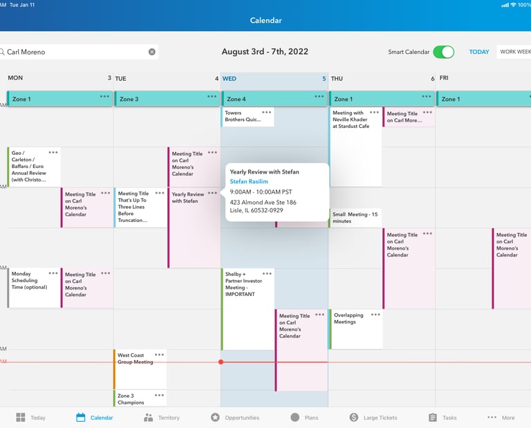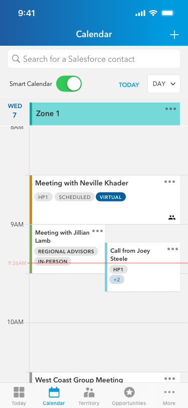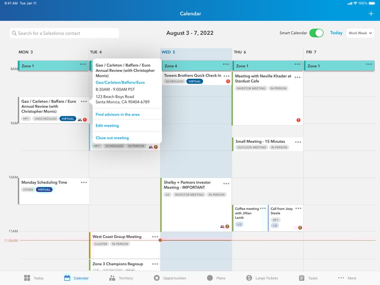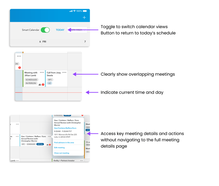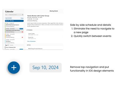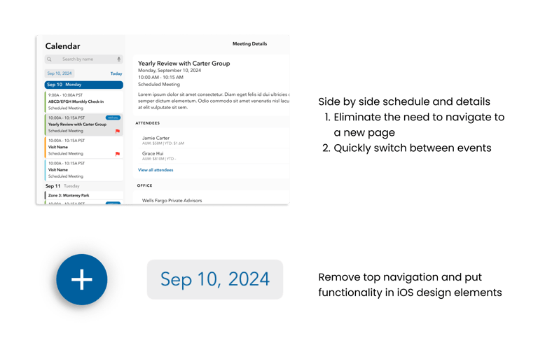 I was the lead designer for a client's Salesforce-based iOS app that external wholesalers use to sell funds to financial advisors. I've included some of the work for Smart Calendar, a new feature to help the wholesalers quickly see their availability and schedule meetings with nearby advisors.